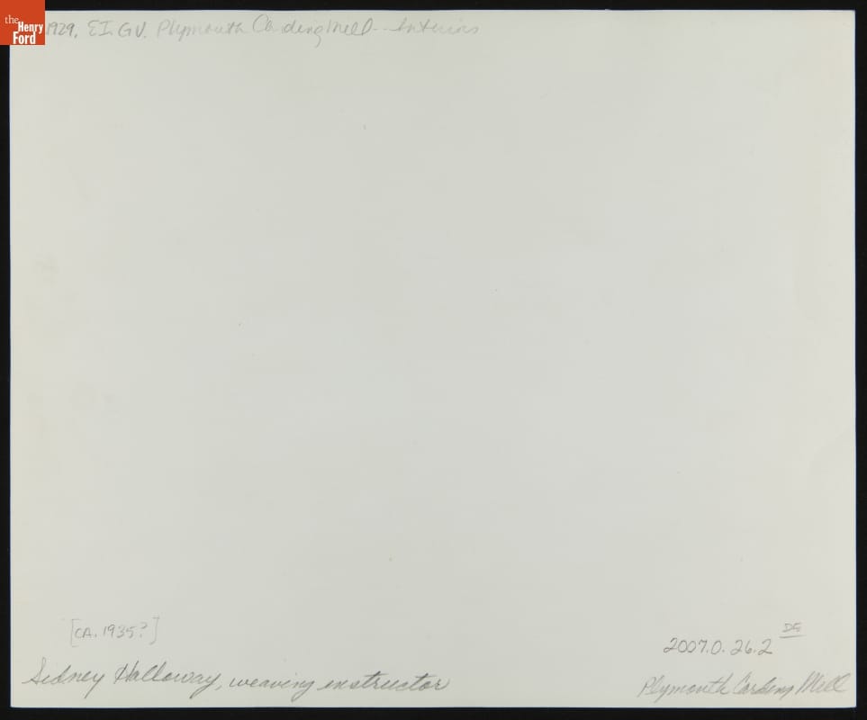 Sidney Holloway (1901-1960) was instrumental in establishing the weaving program at Greenfield Village. Holloway, once employed in the Ford Motor Company's Textile Department, began working with Henry Ford's textile-making collections in 1930. Through hands-on experience and self-study, he mastered the weaving craft. Holloway would engage Greenfield Village visitors for thirty years and pass on his skills to the next generation of artisans.