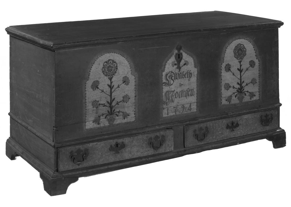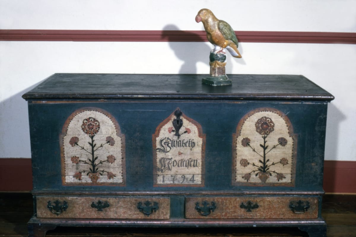 Young women used chests like this one to store linens and other household goods in anticipation of their wedding day. The carnations painted on the front symbolized faithfulness and loyalty.