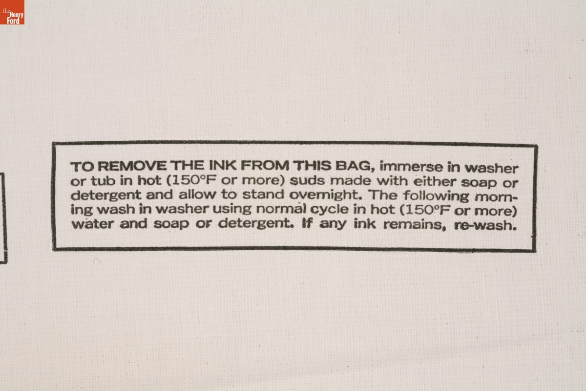 TO REMOVE INK FROM THIS BAG, immerse in washer / or tub of hot (150°F or more) suds made with either soap / or detergent and allow to stand overnight. The following morn- / ing wash in washer using normal cycle in hot (150°F or more) / water and soap or detergent. If any ink remains, re-wash.