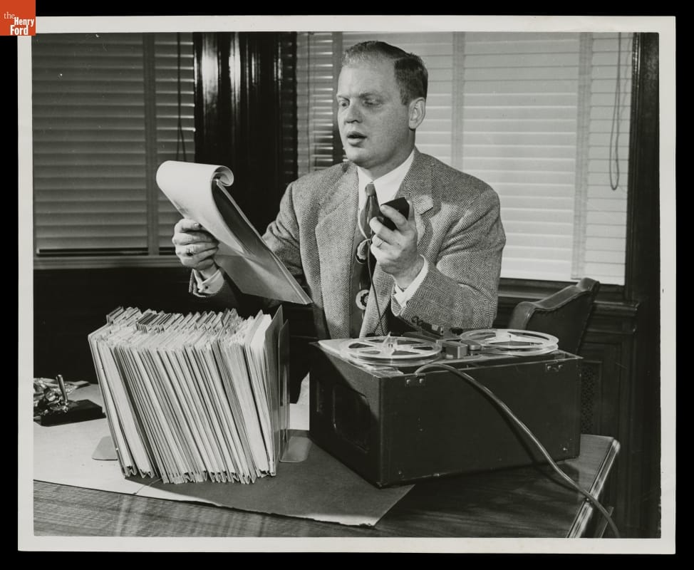 Owen Bombard Working on Oral History Project in Ford Archives at Fair Lane Estate, Dearborn, Michigan, 1953