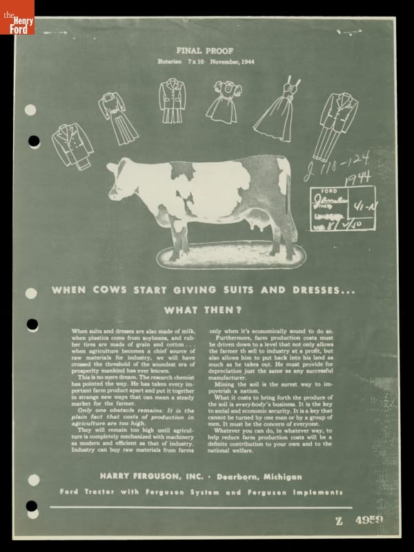 Henry Ford rarely missed an opportunity to promote his idea of farmers growing crops for industry. In this ad for a tractor, much of the copy talks about producing crops for industry. The case for the tractor is made obliquely through references to lowering the cost of production, but it is never actually mentioned in the text.