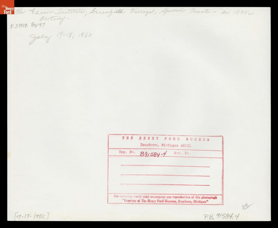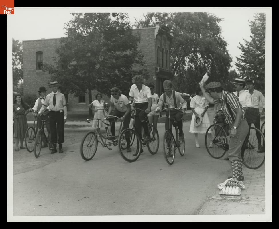 Contestants were photographed at the start of an egg-and-spoon race in Greenfield Village in 1982. The twist: each racer was riding a bicycle. The competition was part of a special event called "An 1890s Outing," held on July 17-18 of that year. Each cyclist had to finish the race without dropping the precariously perched egg.