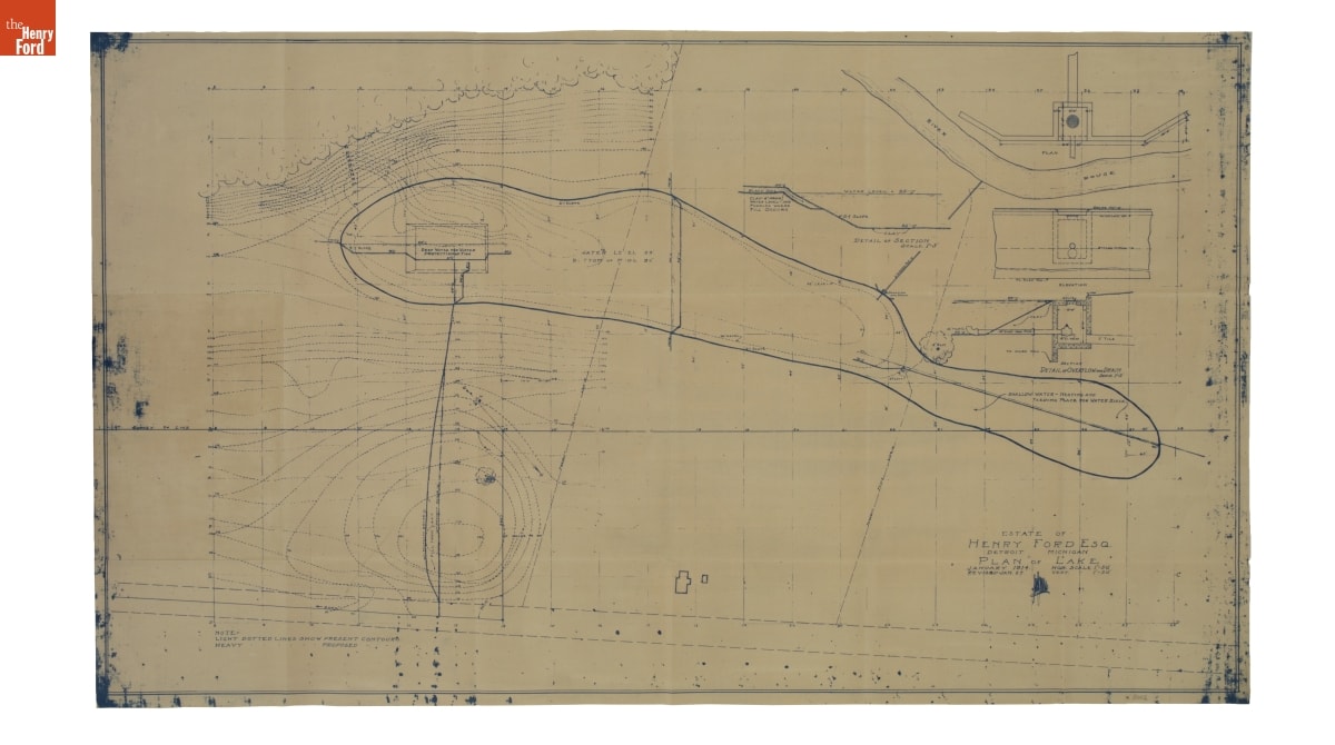 Henry and Clara Ford hired landscape architect Jens Jensen to design the grounds surrounding Fair Lane -- the Fords' 1300-acre Rouge River estate. Jensen envisioned naturalistic meadows, gardens, orchards, grottoes, and wandering paths for the nature-loving couple to enjoy. He also created a lake at the end of a meadow. This drawing shows Jensen's plan for the lake and surrounding area.