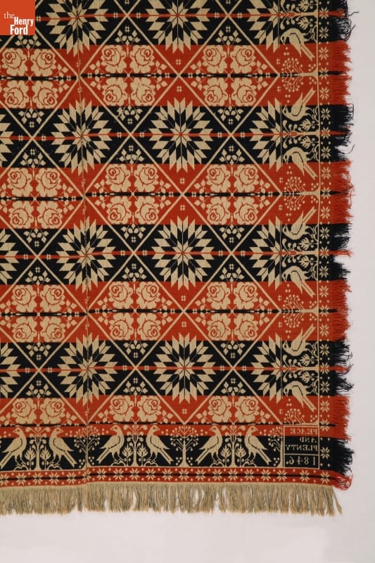 A coverlet is a decorative bedcovering--usually made of cotton and wool--woven on a loom. This "Peace and Plenty" coverlet expresses the optimism of a young America. This popular sentiment and the bird-and-bush Pennsylvania German border motif were used by a number of coverlet weavers, but were combined with different centerfield designs.