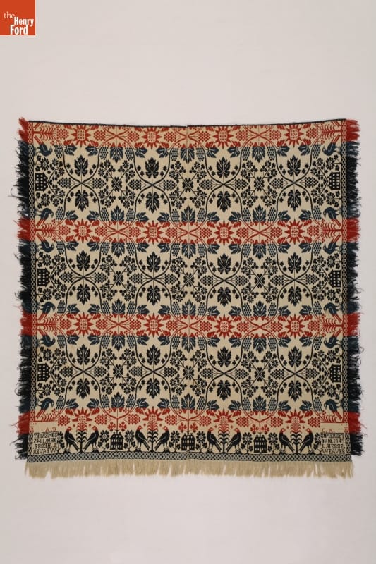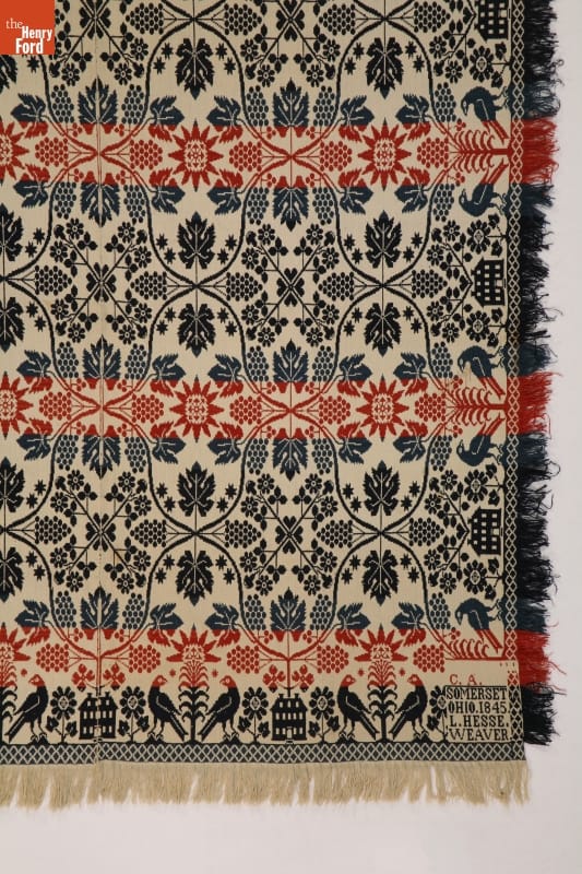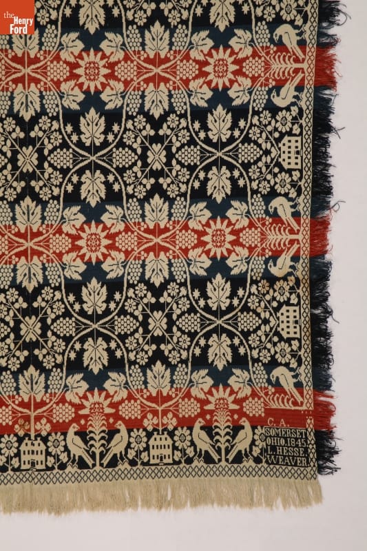 A coverlet is a decorative bedcovering--usually made of cotton and wool--woven on a loom. This coverlet's multiple colors were popular with weavers and clients of German heritage as were the distelfinks (thistle finches) seen in the borders. And, indeed, the weaver of this coverlet, immigrant Leberecht Hesse, was born in Saxony, Germany in about 1809.