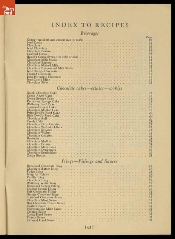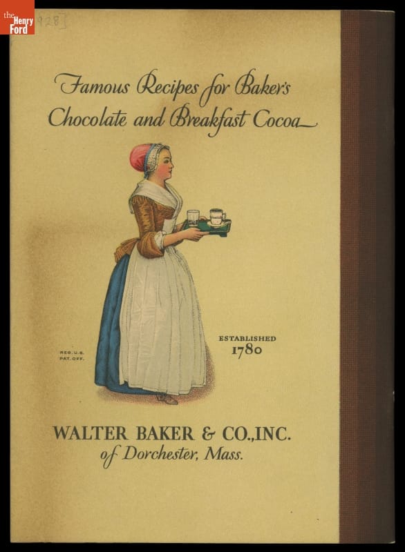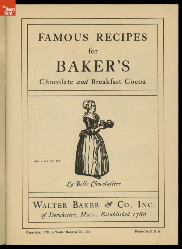 Baker's Chocolate Company -- the oldest manufacturer of chocolate in the United States -- was established in 1780. Over the next two centuries, the company would earn awards for its chocolate and in 1881, the company adopted its recognizable trademarked image, La Belle Chocolatiere (The Chocolate Girl). Since 1870, the company has published cookbooks, like this one, with recipes for beverages and desserts utilizing the company's chocolate products.