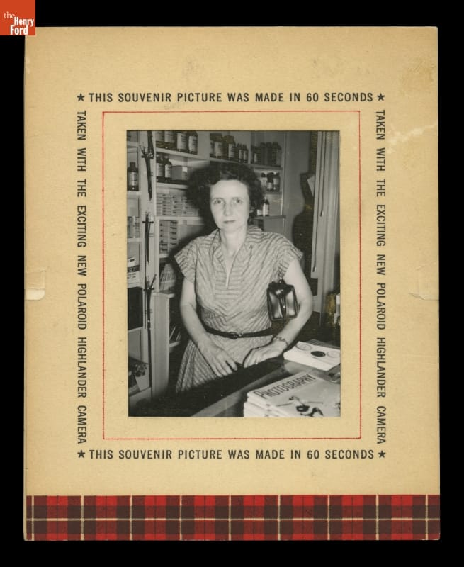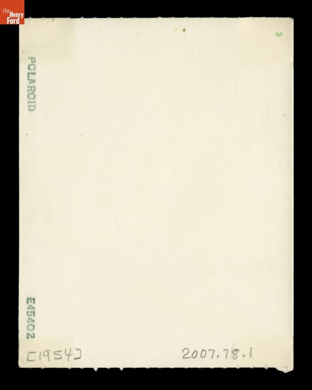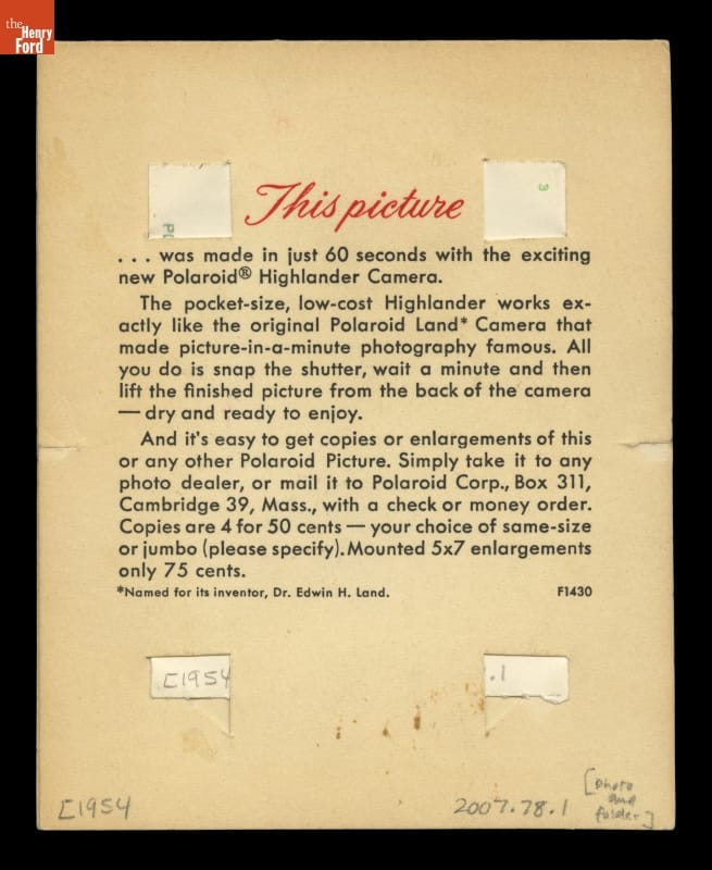 Printed on back: This picture...was made in just 60 second with the exciting new Polaroid Highlander Camera. The pocket-size, low-cost Highlander works exactly like the original Polaroid Land Camera that made picture-in-a-minute photography famous. All you do is snap the shutter, wait a minute and then lift the finished picture from the back of the camera--dry and read to enjoy! And it's easy to get copies or enlargements of this or any other Polaroid Picture...