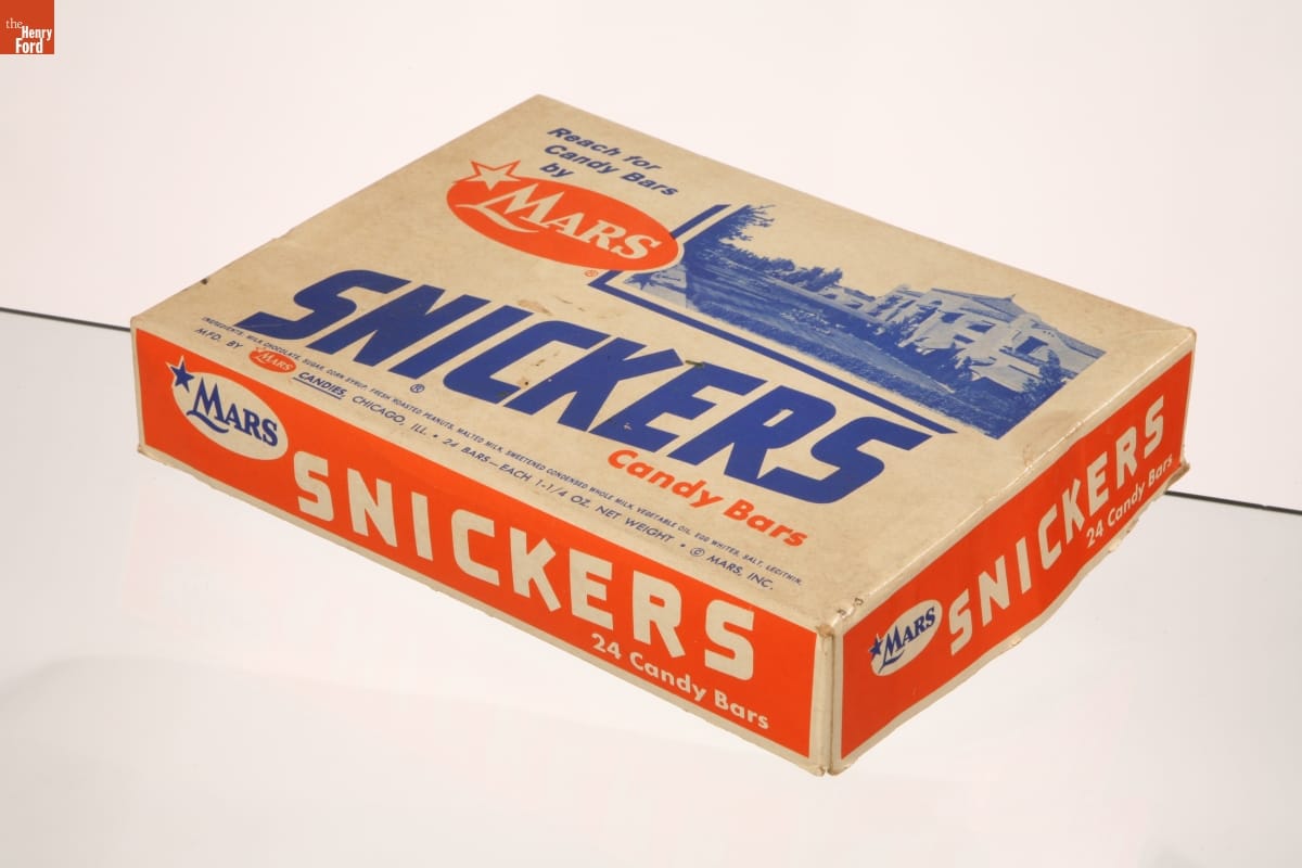 Mars Incorporated introduced Snickers in 1930. The chocolate-covered peanut, caramel and nougat candy bar quickly became a best-selling treat. Costumers could find this popular sweet, chewy snack displayed on a store's counter in a box like this.
