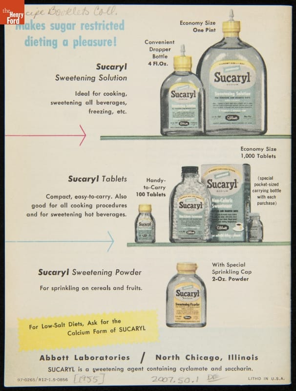 Artificial sweeteners provide dieters and people with diabetes or other metabolic disorders with a sugar substitute. Sucaryl, a cyclamate-based sweetener, was first marketed to the public in 1951. Though Sucaryl promised sweet-tasting foods without adding calories, links to possible increased cancers risks spurred the Food and Drug Administration to ban cyclamates in 1969.
