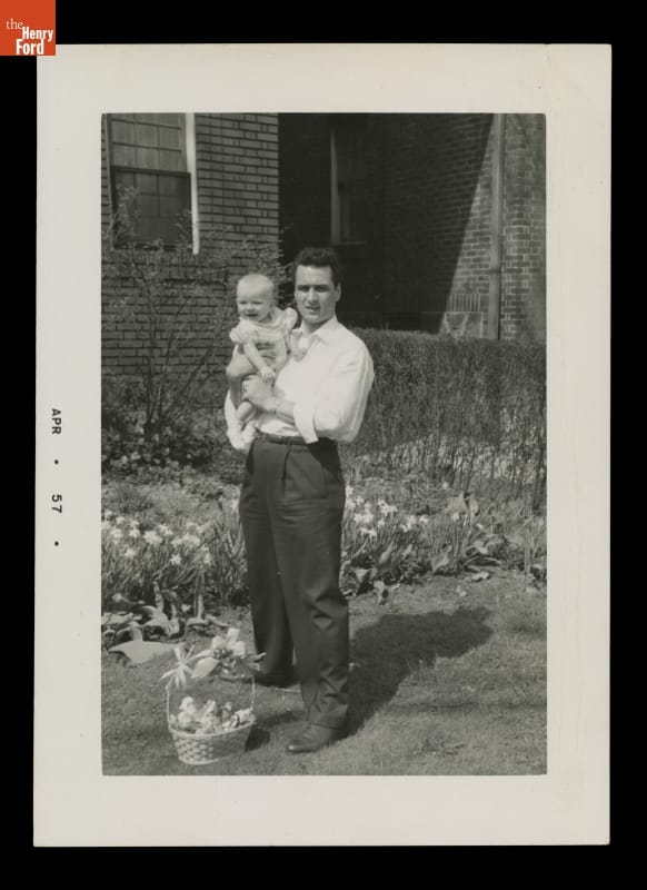 Man Holding Baby Girl next to Easter Basket, 1957