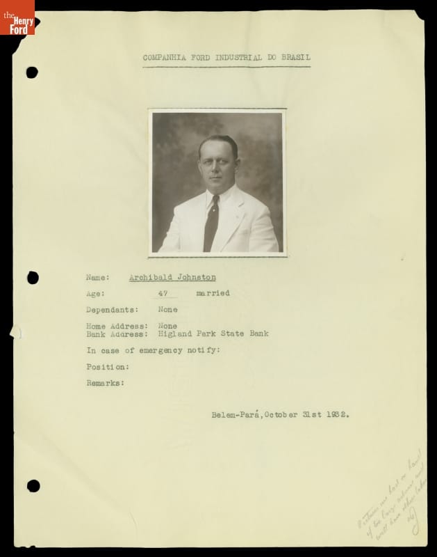 Companhia Ford Industrial Do Brasil / Archibald Johnston / Age 47 married / ... / Belem-Para', October 31st, 1932 /.
