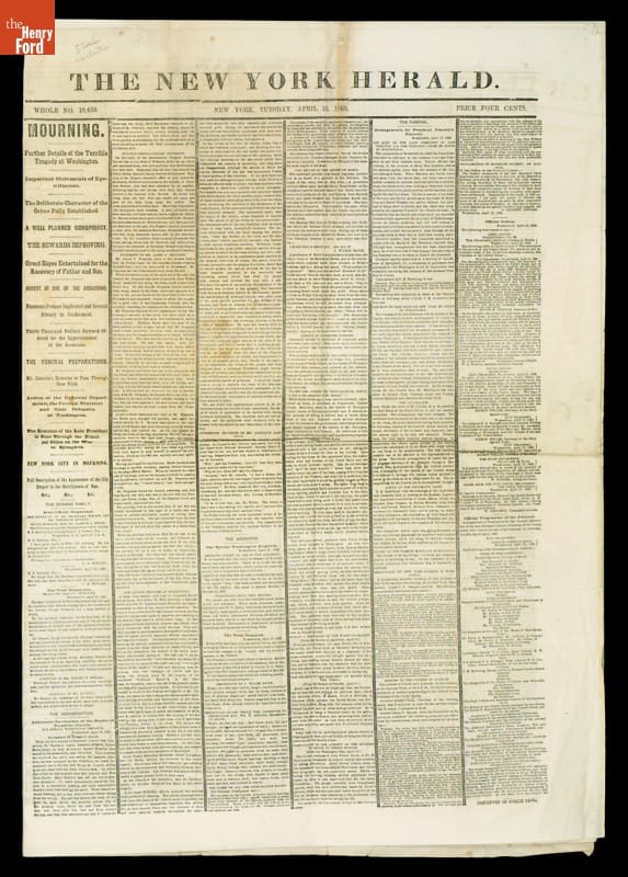 This April 18, 1865, issue of the New York Herald shows the way many newspapers reported the developing news surrounding President Abraham Lincoln's death and the funeral preparations. The editors took the unusual step of devoting the entire front page to the continuing events. Between each column of text, they used large dark lines to signify mourning for the President.