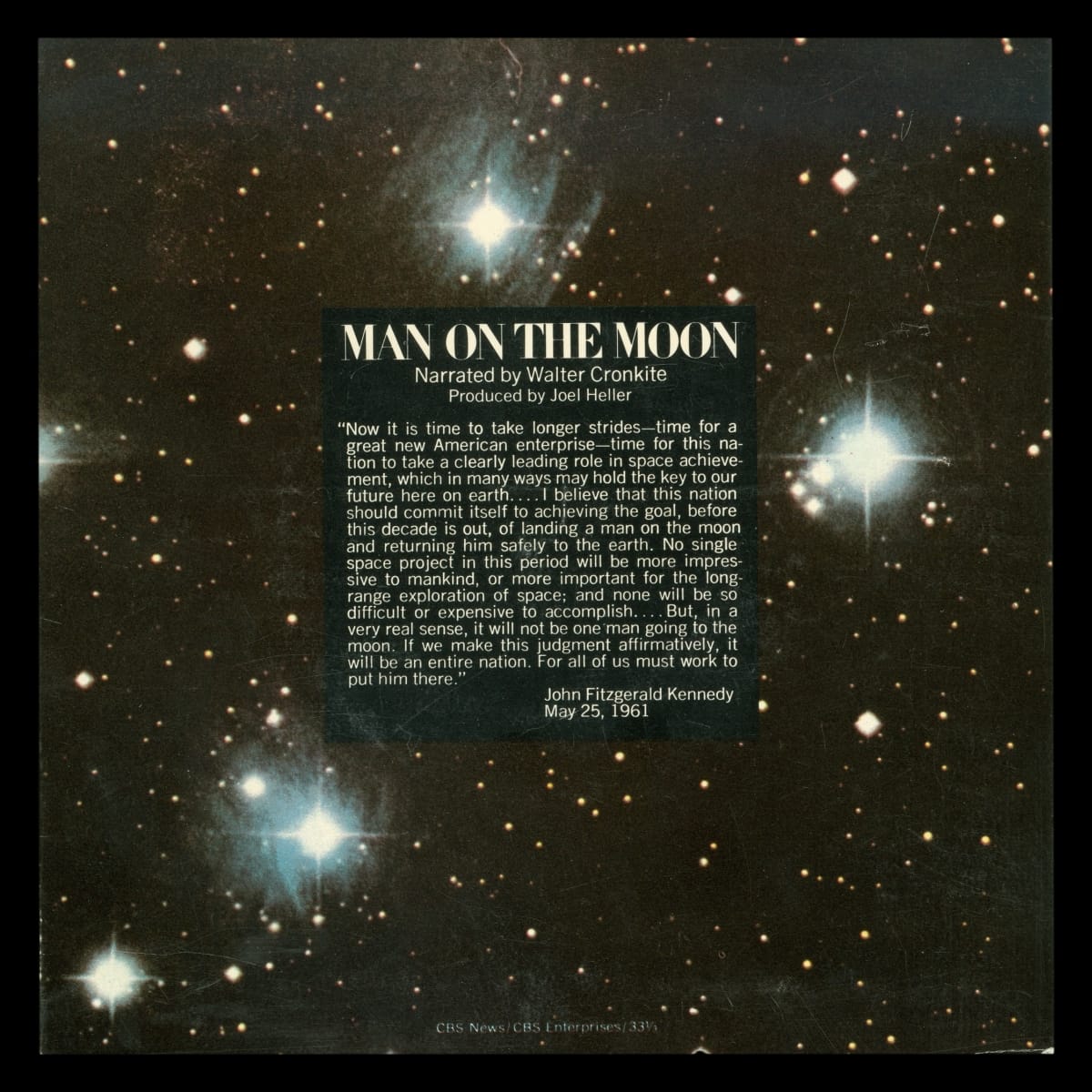 printed on back center of record cover: MAN ON THE MOON / Narrated by Walter Cronkite / Produced by Joel Heller / "Now it is time to take longer strides--time for a great new American enterpirse . . . John Fitzgerald Kennedy / May 25, 1961