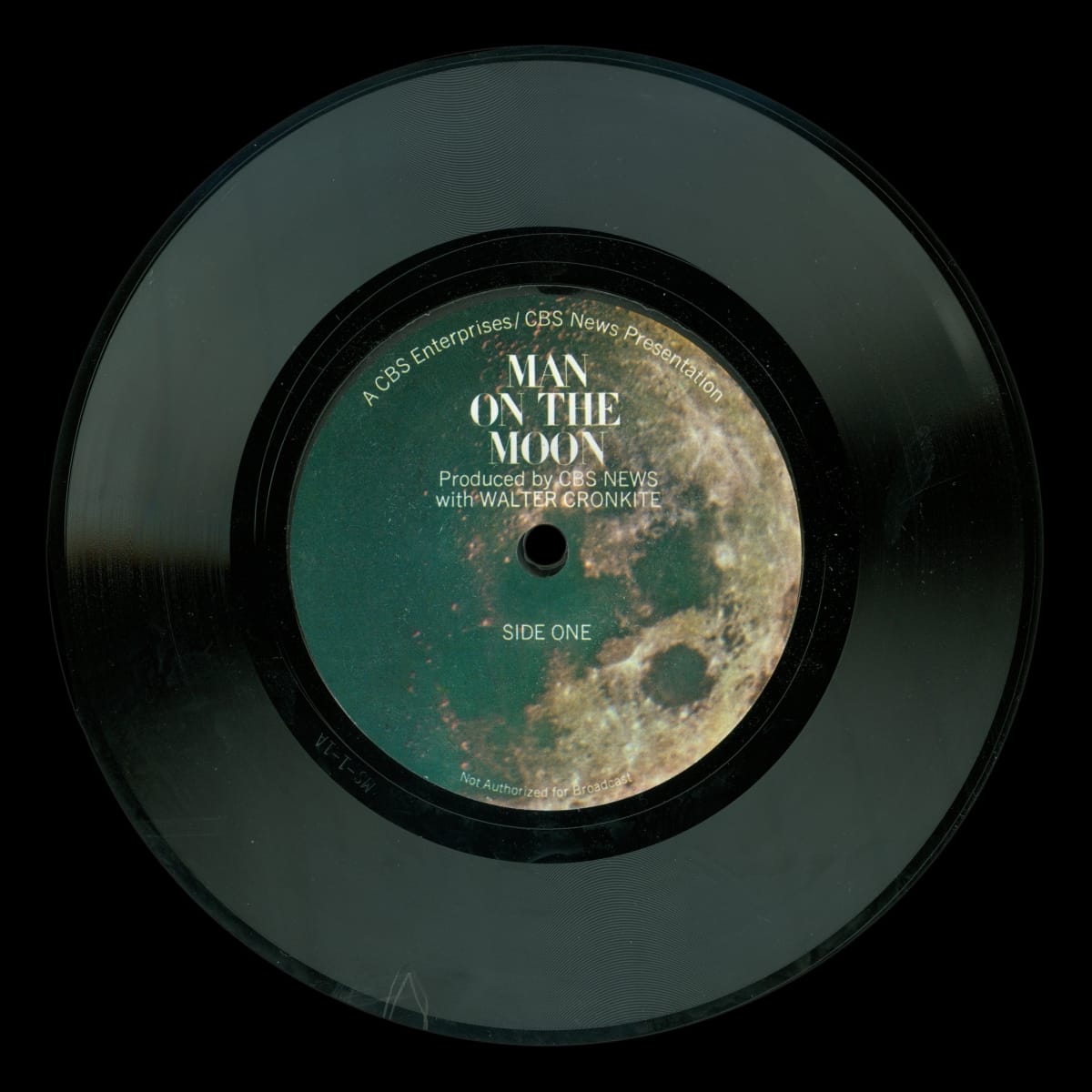 printed on label of long-playing record, side one: A CBS Enterprises/CBS News Presentation / MAN / ON THE / MOON / Produced by CBS NEWS / with WALTER CRONKITE / SIDE ONE / Not Authorized for Broadcast