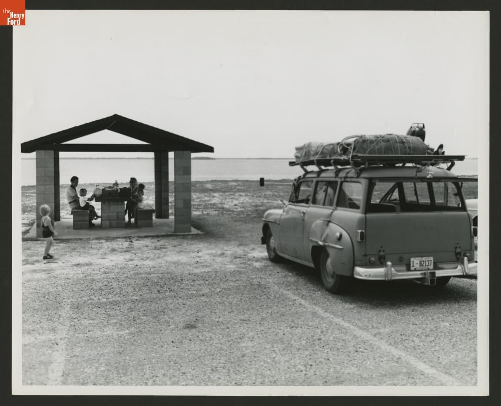 Family road trips became easier with better roads and more comfortable cars. This photograph from the about 1957 shows a family picnicking near the beach in St. Petersburg, Florida. Their ca. 1950 Plymouth Suburban is packed for adventure.