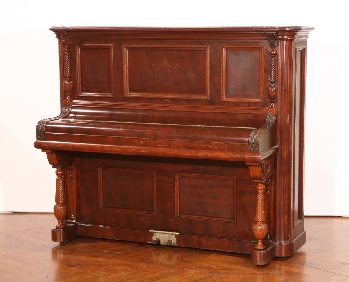 Date on primary action rail: November 23, ‘93 On soundboard: NIEKE [signature] On soundboard top left: 45298 On soundboard, top right: HARDMAN / NEW YORK On top of soundboard: PAT. JULY 13, 1880 PAT. DEC. 14, 1880 PAT. APRIL 20, 1881 PAT. APRIL 3, 1886 PAT. HARP STOP APRIL 6, 1886 METALIC BOTTOM PATENTED MARCH 25, 1886 On underside of fallboard: Hardman / HARDMAN, PECK & CO. / ESTD. 1842 / NEW YORK. Above center of keyboard: Cabinet Grand.