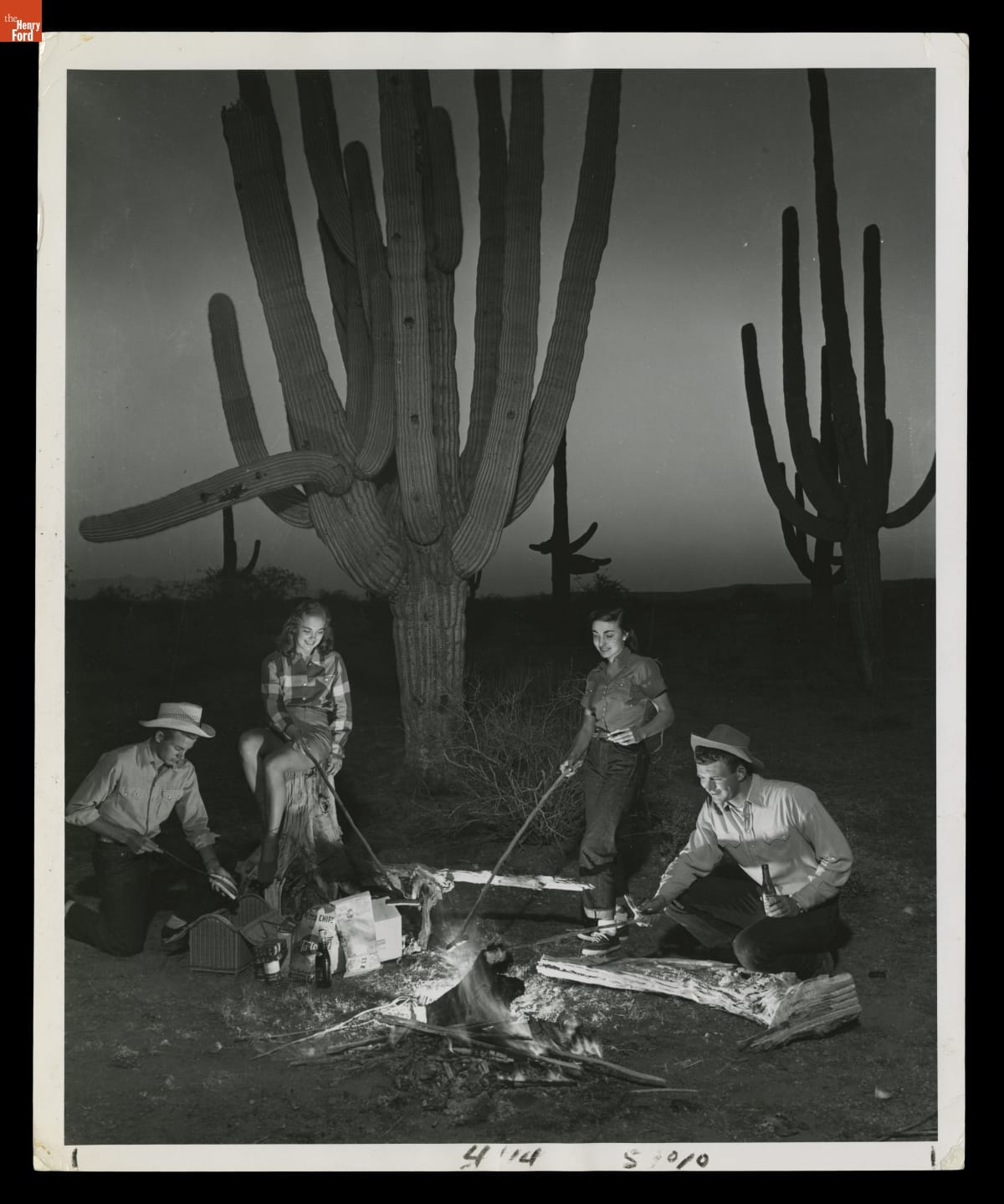 A group of happy people roasts hot dogs by the light of the desert moon in this photo taken in 1955. The cactus, like the grand specimens surrounding these reveling roasters, is an enduring symbol of Arizona. The saguaro cactus blossom was designated the state's official flower in 1931.
