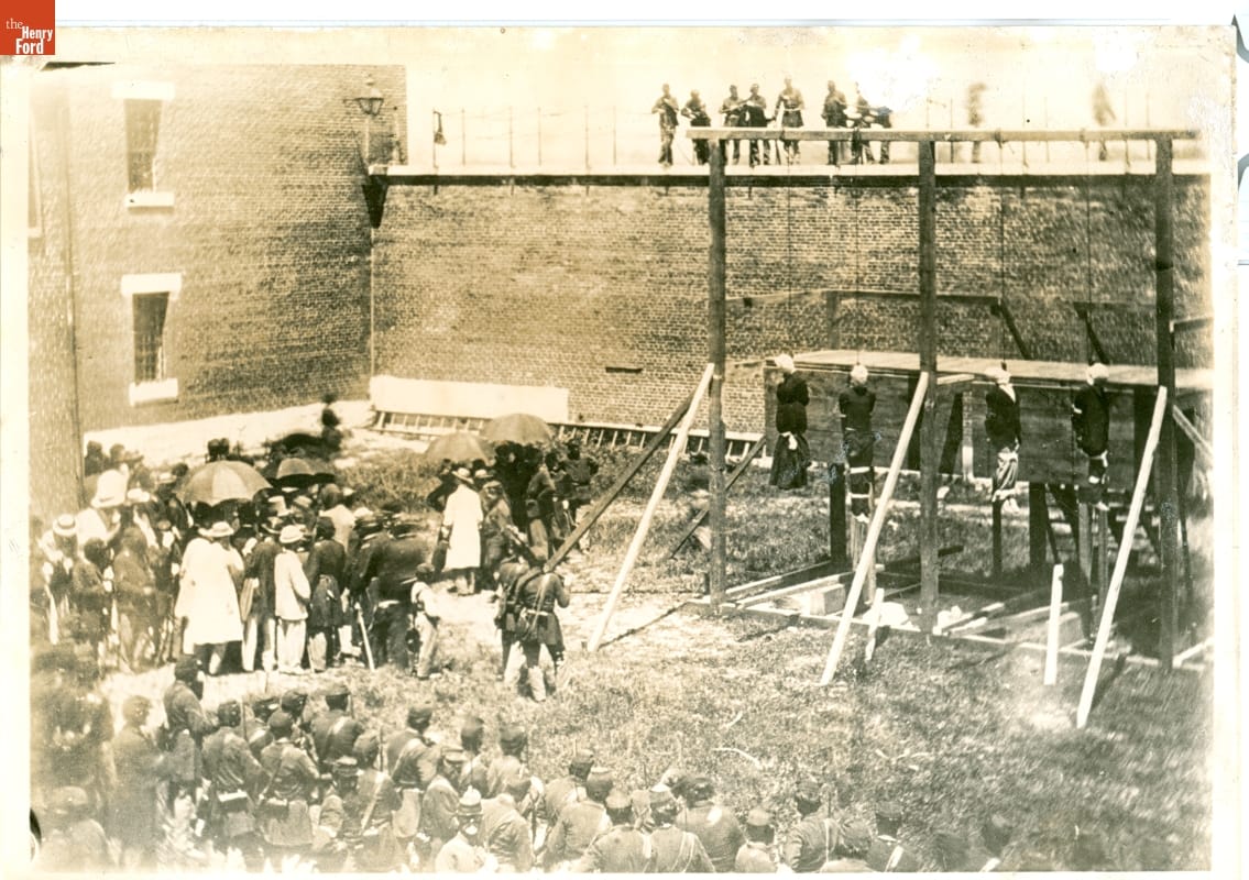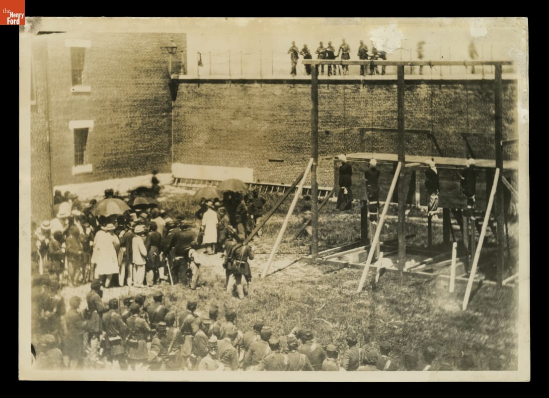 Before the existence of newspaper photos and television, prints and card photographs helped people to understand the tragic event of President Lincoln's death in April 1865. This photo shows the four convicted and executed Lincoln assassination conspirators hanging from gallows at the Washington Arsenal on July 7, 1865. It is a later print of Alexander Gardner's original photographic negative made at the scene.