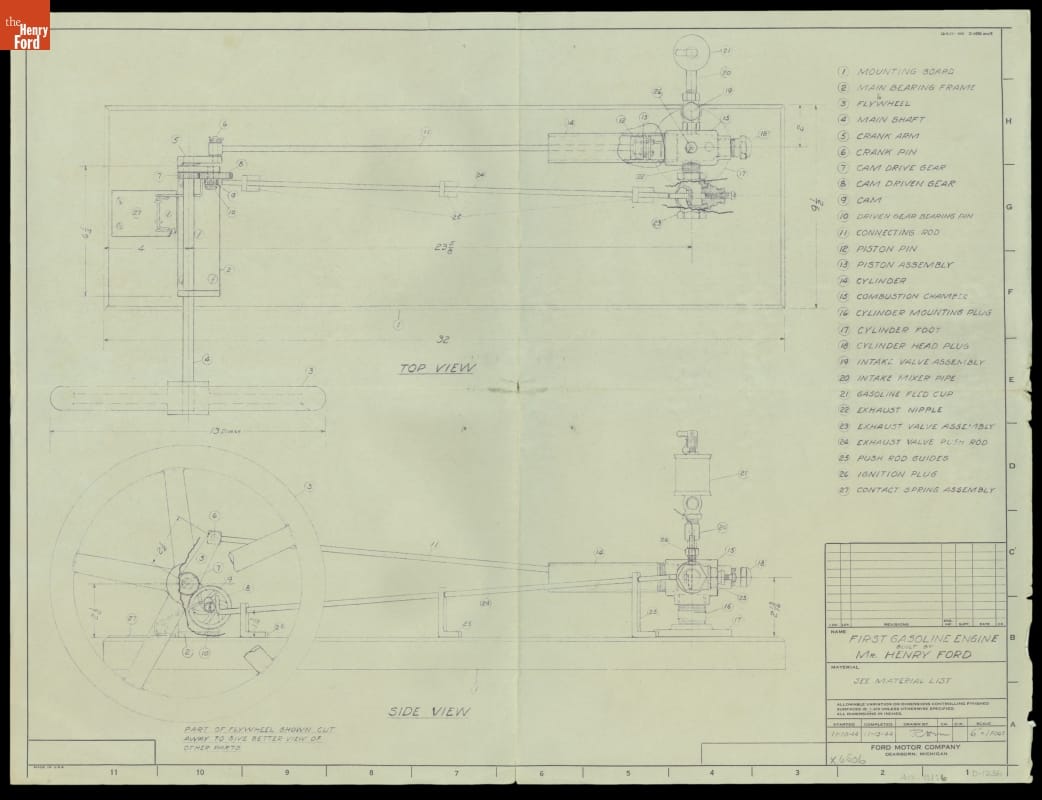 Printed lower right corner: FIRST GASOLINE ENGINE / BUILT BY / MR. HENRY FORD