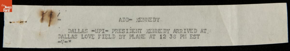 In the routine course of business, Ford Motor Company received a steady flow of news and financial reports from the Wall Street Journal. These dispatches came over the teletype machine on November 22, 1963 describing events from the arrival of President John F. Kennedy and his wife Jacqueline in Dallas through the official report of his death several hours later.