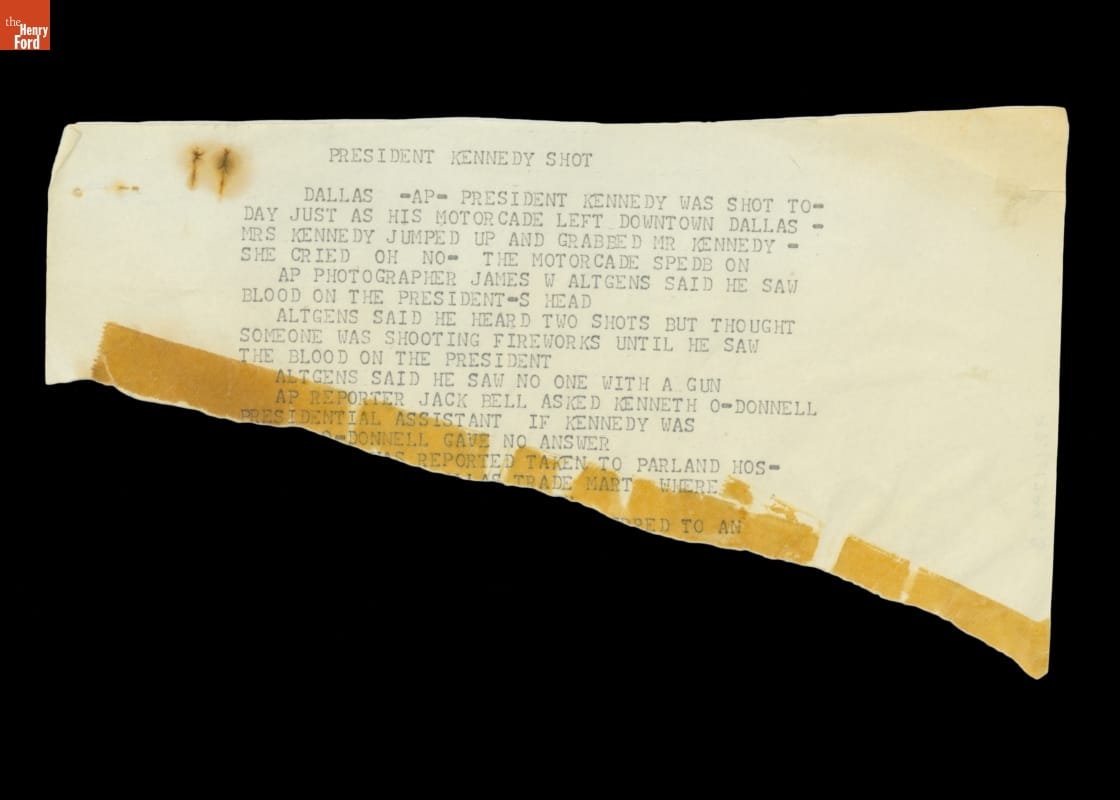 In the routine course of business, Ford Motor Company received a steady flow of news and financial reports from the Wall Street Journal. These dispatches came over the teletype machine on November 22, 1963 describing events from the arrival of President John F. Kennedy and his wife Jacqueline in Dallas through the official report of his death several hours later.