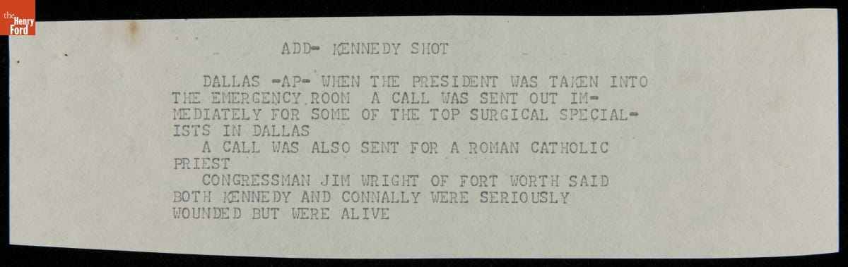 In the routine course of business, Ford Motor Company received a steady flow of news and financial reports from the Wall Street Journal. These dispatches came over the teletype machine on November 22, 1963 describing events from the arrival of President John F. Kennedy and his wife Jacqueline in Dallas through the official report of his death several hours later.