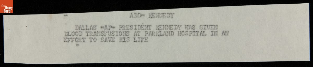 In the routine course of business, Ford Motor Company received a steady flow of news and financial reports from the Wall Street Journal. These dispatches came over the teletype machine on November 22, 1963 describing events from the arrival of President John F. Kennedy and his wife Jacqueline in Dallas through the official report of his death several hours later.
