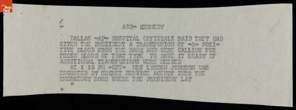 In the routine course of business, Ford Motor Company received a steady flow of news and financial reports from the Wall Street Journal. These dispatches came over the teletype machine on November 22, 1963 describing events from the arrival of President John F. Kennedy and his wife Jacqueline in Dallas through the official report of his death several hours later.