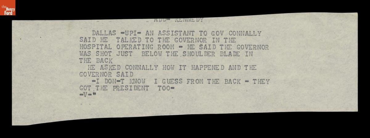 In the routine course of business, Ford Motor Company received a steady flow of news and financial reports from the Wall Street Journal. These dispatches came over the teletype machine on November 22, 1963 describing events from the arrival of President John F. Kennedy and his wife Jacqueline in Dallas through the official report of his death several hours later.