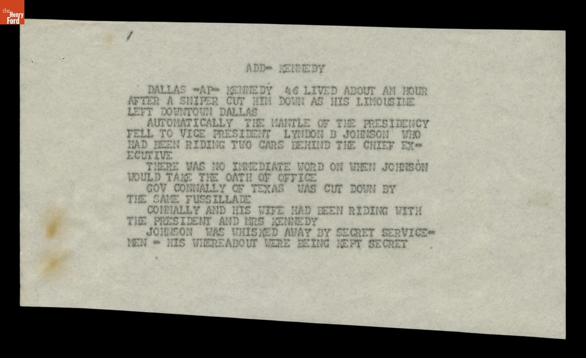 In the routine course of business, Ford Motor Company received a steady flow of news and financial reports from the Wall Street Journal. These dispatches came over the teletype machine on November 22, 1963 describing events from the arrival of President John F. Kennedy and his wife Jacqueline in Dallas through the official report of his death several hours later.
