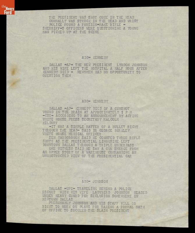 Printed on front: THE PRESIDENT WAS SHOT ONCE IN THE HEAD / CONNALLY WAS STRUCK IN THE HEAD AND WRIST / POLICE FOUND A FOREIGN-MAKE RIFLE - / SHERIFF-S OFFICERS WERE QUESTIONING A YOUNG / MAN PICKED UP AT THE SCENE / ADD - KENNEDY / DALLAS - AP - THE NEW PRESIDENT LYNDON JOHNSON / AND HIS WIFE LEFT THE HOSPITAL A HALF HOUR AFTER / KENNEDY DIED - NEWSMEN HAD NO OPPORTUNITY TO QUESTION THEM / ADD - KENNEDY / DALLAS - AP - KENNEDY DIED OF A GUNSHOT / WOUND IN THE BRAIN AT APPROXIMATELY 1 PM / -CST- ACCORDING TO AN ANNOUNCEMENT BY ACTING / WHITE HOUSE PRESS SECRETARY MALCOLM KILDUFF /- IT WAS A SIMPLE MATTER OF A BULLET RIGHT / THROUGH THE HEAD - SAID DR GEORGE BURKLEY / WHITE HOUSE MEDICAL OFFICER / SEN YARBOROUGH SAID HE COUNTED THREE RIFLE / SHOTS AS THE PRESIDENTIAL LIMOUSINE LEFT / DOWNTOWN DALLAS THROUGH A TRIPLE UNDERPASS / ONE WITNESS SAID HE SAW A GUN EMERGE FROM / AN UPPER STORY OF A WAREHOUSE COMMANDING AN / UNOBSTRUCTED VIEW OF THE PRESIDENTIAL CAR / ADD - JOHNSON / DALLAS - UPI - TRAVELING BEHIND A POLICE / ESCORT WITH HIS WIFE LADYBIRD JOHNSON HEADED / UNDER HEAVY GUARD FOR SECLUSION SOMEWHERE IN / MIDTOWN DALLAS / PRESUMABLY JOHNSON AND HIS STAFF WILL GO / RIGHT TO WORK ON PLANS FOR TAKING A FORMAL / OATH OF OFFICE TO SUCCEED THE SLAIN PRESIDENT