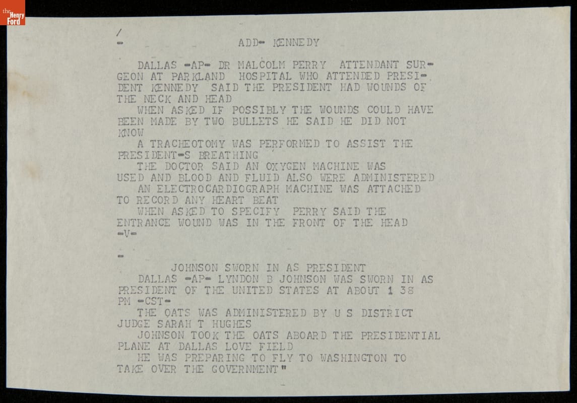 In the routine course of business, Ford Motor Company received a steady flow of news and financial reports from the Wall Street Journal. These dispatches came over the teletype machine on November 22, 1963 describing events from the arrival of President John F. Kennedy and his wife Jacqueline in Dallas through the official report of his death several hours later.