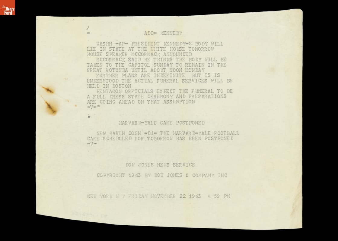 In the routine course of business, Ford Motor Company received a steady flow of news and financial reports from the Wall Street Journal. These dispatches came over the teletype machine on November 22, 1963 describing events from the arrival of President John F. Kennedy and his wife Jacqueline in Dallas through the official report of his death several hours later.