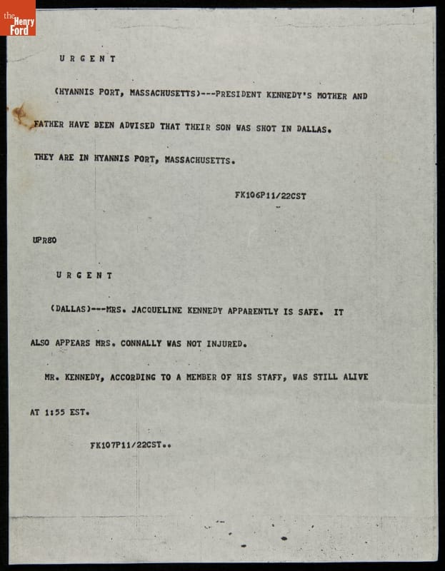 In the routine course of business, Ford Motor Company received a steady flow of news and financial reports from the Wall Street Journal. These dispatches came over the teletype machine on November 22, 1963 describing events from the arrival of President John F. Kennedy and his wife Jacqueline in Dallas through the official report of his death several hours later.