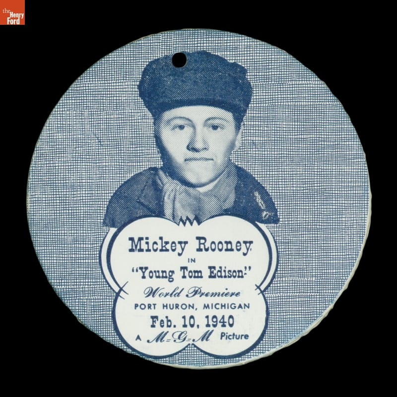 In February 1940, MGM premiered its film Young Tom Edison in Edison's boyhood home of Port Huron, Michigan. The movie starred Mickey Rooney as the young inventor. This small souvenir contains an image of Thomas Edison as a boy on one side and Rooney in the role of Edison on the other.