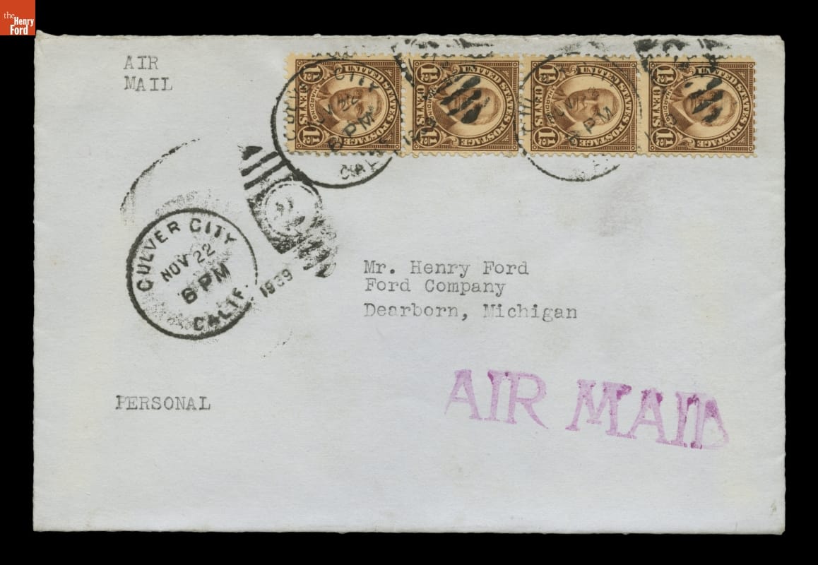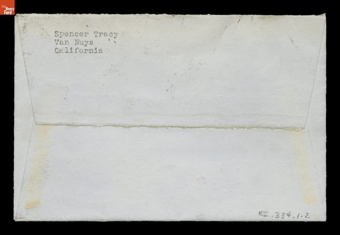 printed on first page: SPENCER TRACY stamped in ink on first page: RECEIVED / NOV 24 1939 / Secretary's Office handwritten in ink: Van Nuys, Calif / Dear Mr. Ford / This letter to you / has been started / before -- / I seem unable / to find words to / adequately express / the deep and / lasting imprint-- / my short visit with / you has made / upon me-- and / so-- as I can / not put it here-- / you first must / know it is / in me-- and shall / remain. / Thank you again / sir, for your great / kindness and courtesy. / The only way in / which I may in some / way return all your / hours given me is / to promise that I shall / make a supreme / effort to do some / small justice and / no harm to the memory / of your dear friend-- / Respectfully yours-- / Spencer Tracy / P.S. Please come out for / a visit while we are making / the picture-- typewritten on envelope: Mr. Henry Ford / Ford Company / Dearborn, Michigan / PERSONAL stamped in ink on envelope: AIR MAIL postmark stamped on envelope: CULVER CITY / NOV 22 6 PM / CALIF typewritten on envelope: Spencer Tracy / Van Nuys / California