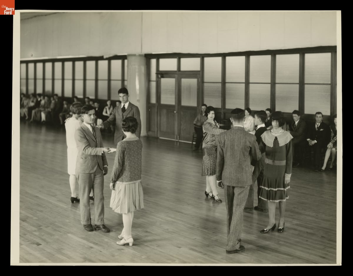 Henry Ford created a room for dancing at Ford Motor Company's Engineering Lab, where his office and the company's engineering activities were located. These students are learning the traditional American dances of Henry Ford's youth -- along with dance etiquette. Later, Ford built Lovett Hall, an elegant ballroom named for his dancing master.