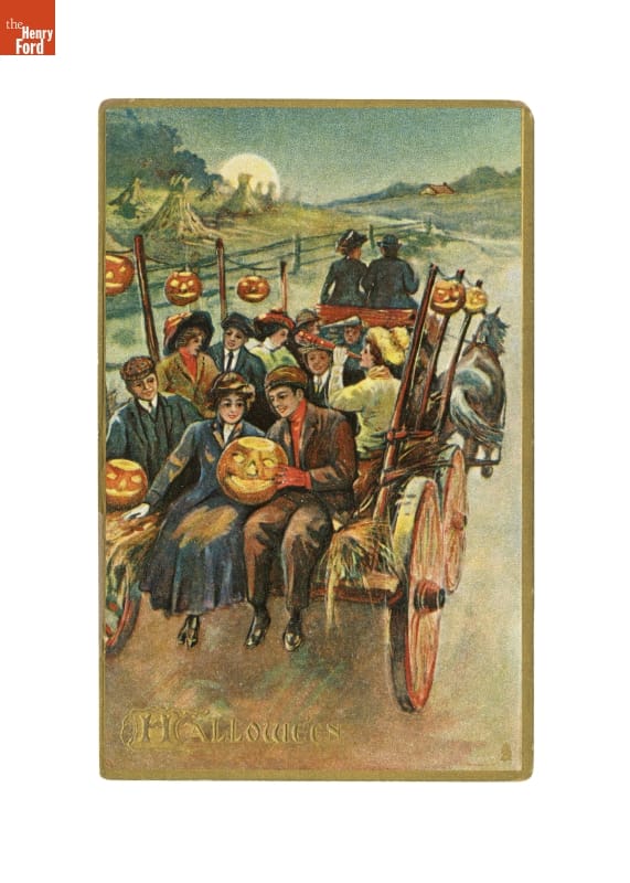 The first American Halloween gatherings were designed as matchmaking parties for young people, with games to "predict" matrimonial futures and ample opportunity for innocent flirtation. Friends and neighbors often exchanged seasonal greeting postcards - such as this colorful example from about 1912 - that depicted these holiday amusements.
