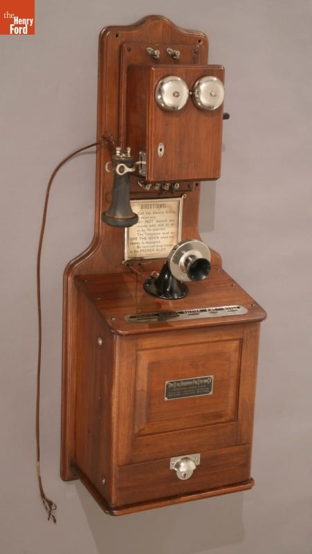 By 1905, telephones had been around for almost thirty years. Although most people didn't have phones in their homes, they had become indispensable in certain situations -- business and emergencies. Hotels, grocery stores, and restaurants owners often installed pay telephones in their establishments. This phone features William Gray's mechanism for making a secure pay phone, which was licensed to many phone manufacturers.