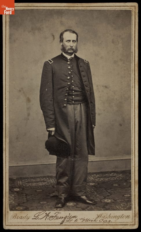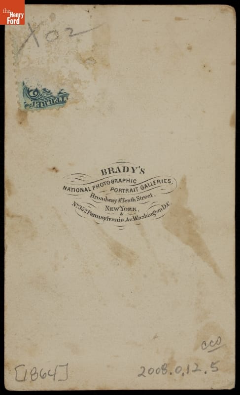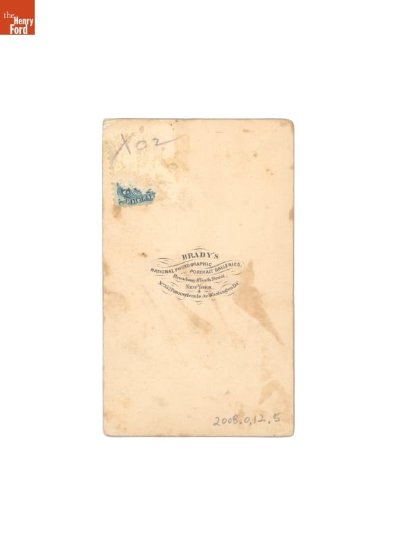 Mathew B. Brady's photography studio in Washington, D.C., made this full-length standing portrait in 1864. A successful photographer since 1841, Brady owned studios in Washington and New York City and became renowned for portraits of notable personalities of the time. Starting in 1861 he had the ambitious goal of documenting all aspects of the Civil War. To do this he hired many photographers to work in his studios and in the field to capture images of battles, life on the front, and important military figures. As was the custom, Brady did not identify individual photographers working for his company. However, many went on to become successful photographers in their own right, such as Alexander Gardner and Timothy O'Sullivan. Brady's vision and longevity created photographs that are meaningful records of this important time in United States history.