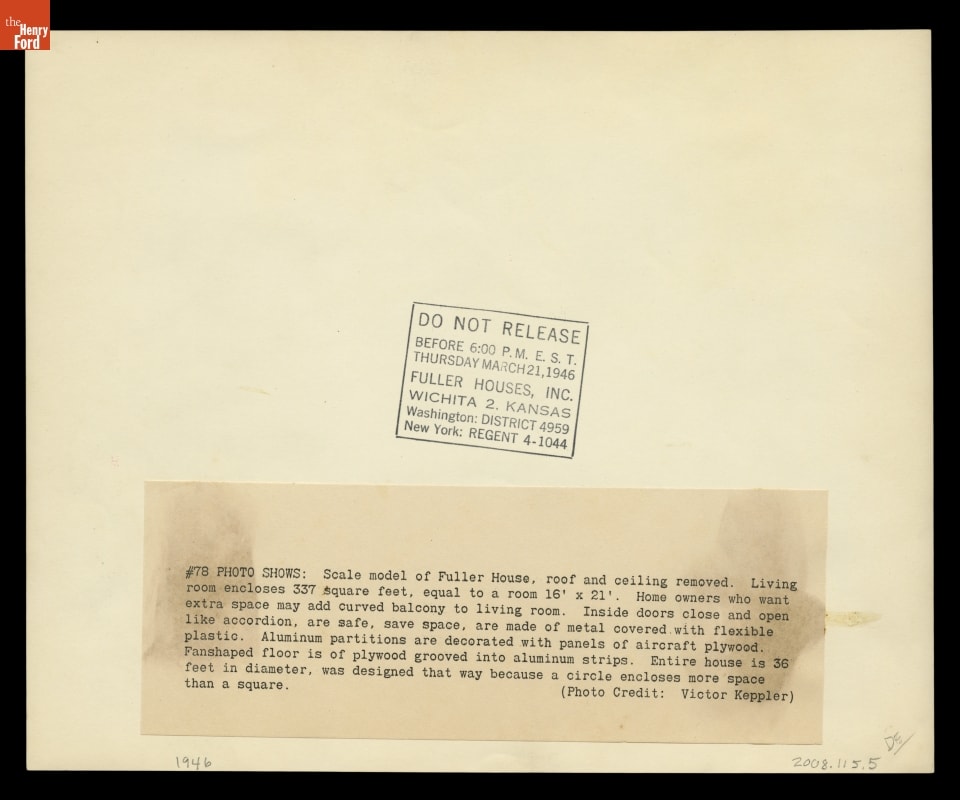 Stamped in black ink on back: DO NOT RELEASE / BEFORE 6:00 P.M. E.S.T. / THURSDAY MARCH 32, 1946 / FULLER HOUSES, INC. / WICHITA 2, KANSAS / Washington: DISTRICT 4959 / NEW YORK: REGENT 4-1044