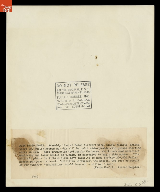 Stamped in black ink on back: DO NOT RELEASE / BEFORE 6:00 P.M. E.S.T. / THURSDAY MARCH 32, 1946 / FULLER HOUSES, INC. / WICHITA 2, KANSAS / Washington: DISTRICT 4959 / NEW YORK: REGENT 4-1044