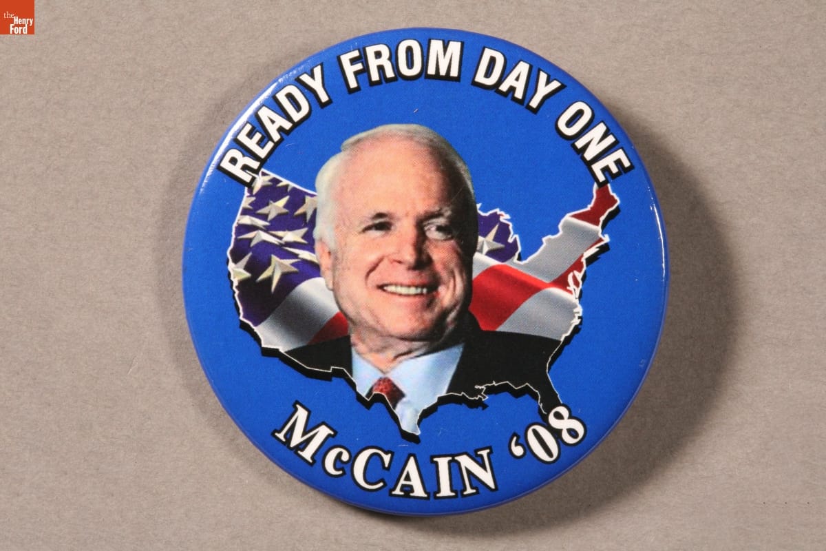 Arizona Senator John McCain was the 2008 Republican Party's presidential nominee. Republican campaign material touted the political experience of this long-serving member of the Senate over that of his opponent, Illinois Senator Barack Obama. (Obama had served less than one term.) McCain, as this button reminded voters, was ready to serve from day one.