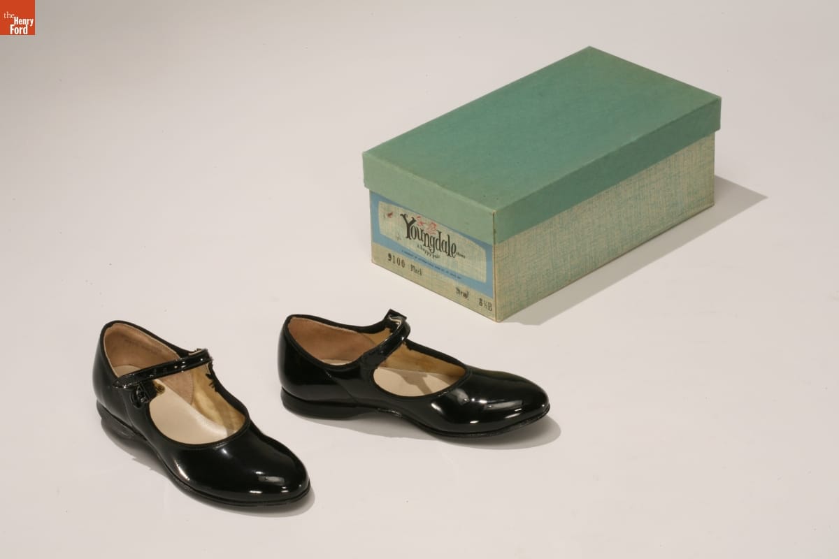 Mary Janes are flat-soled shoes with straps that fasten across the instep. Named after a Buster Brown comic strip character, these simple shoes have remained a popular style for children -- especially little girls -- since the late 1800s. This pair was part of the stock from the Carey Boot Shop in Charlevoix, Michigan.