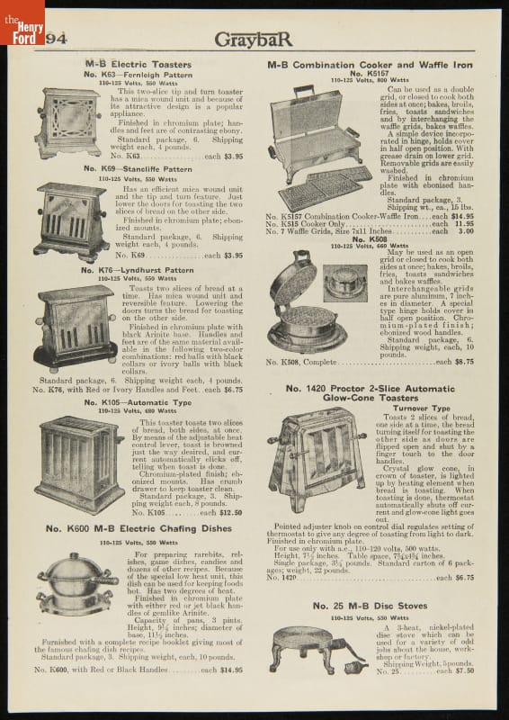 694 GraybaR / M-B ELectric Toaster / No. K63 / No. K69 / No. K76 / No.K105 / No. K600 Chafing Dishes / No.5157 Cooker / No. K508 / No. 1420 Proctor...TOasters / No. 25 M-B Disc Stoves