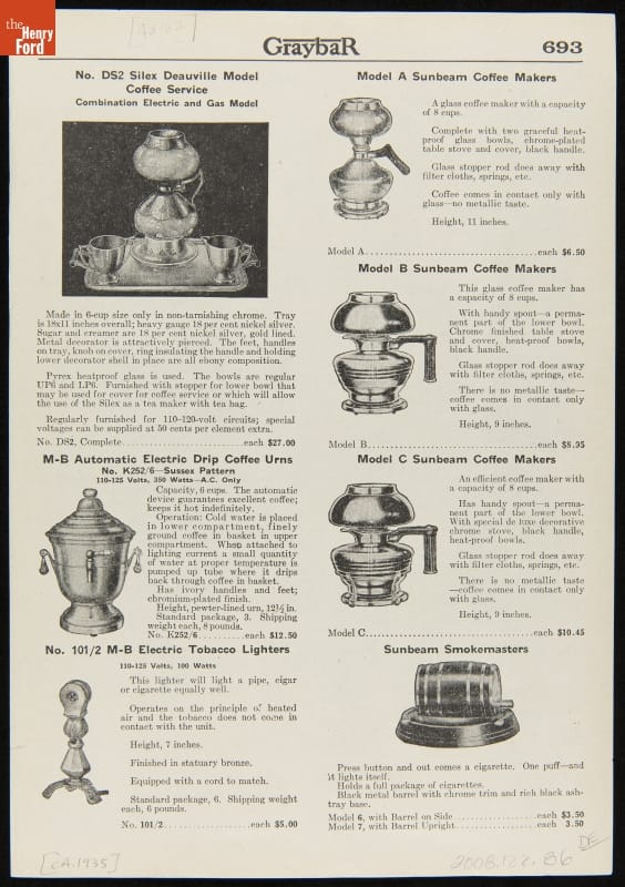 No. DS2 Silex Deauville Model Coffee Service / Model A Sunbeam Coffee Makers / Model B Sunbeam Coffee Makers / M-B automatic Electric Drip Coffee Urns / Model C Sunbeam Coffee Makers / No 10 1/2 M0B Electric Tobacco Lighters / Sunbeam Smokemasters
