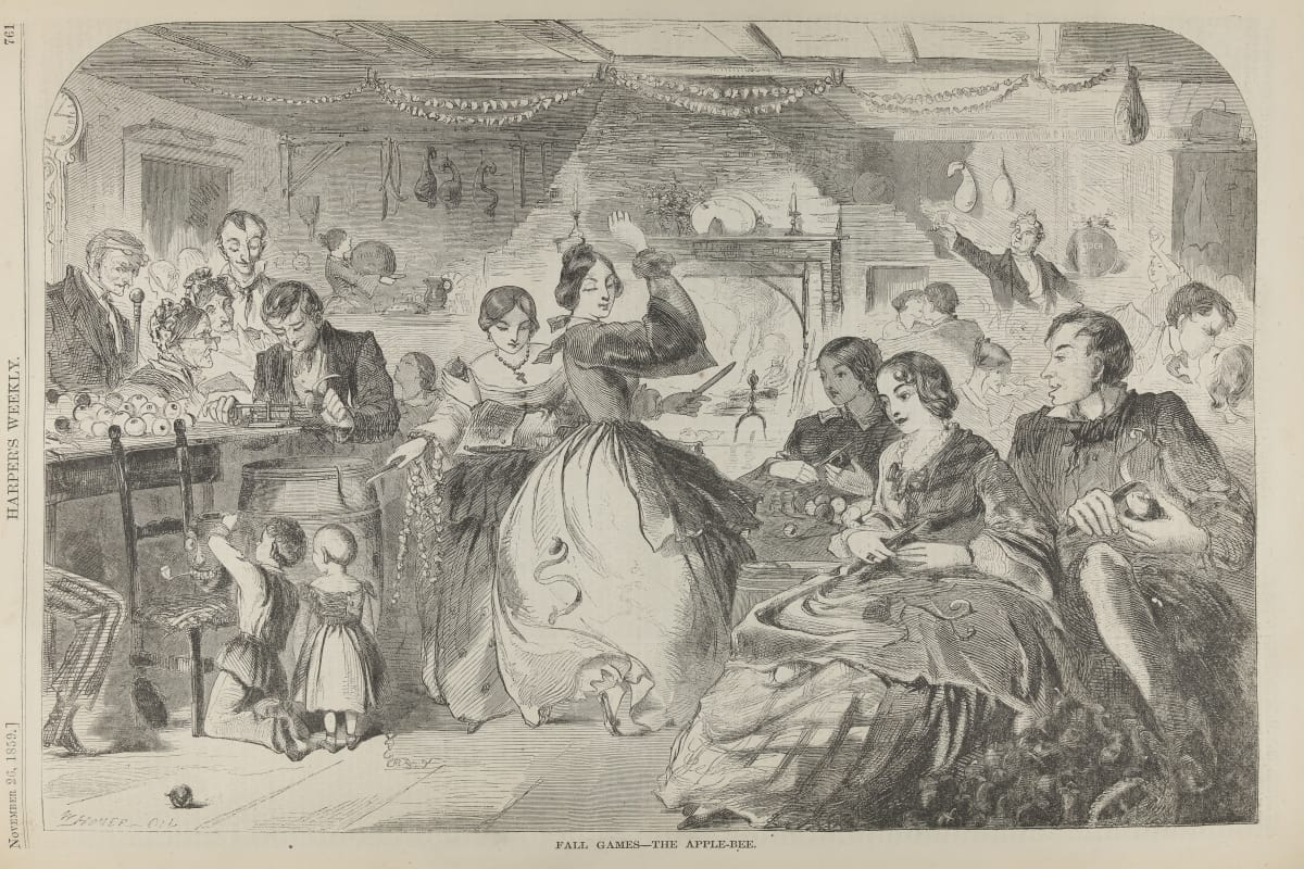Harper's Weekly began publishing in 1857. Readers could find news, fictional works, essays and illustrations. This 1859 issue, with a serialized story on the front, contains an engraving titled "Fall Games -- the Apple-Bee." This illustration, by Winslow Homer, depicts life and love at an autumn gathering in mid-19th century America.
