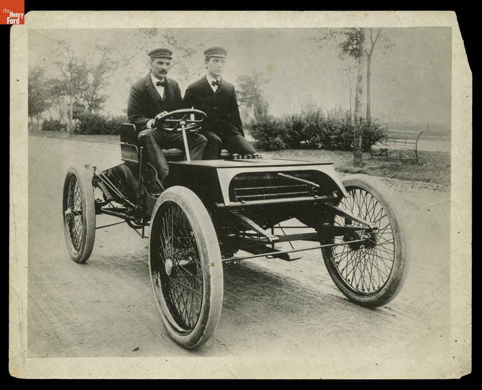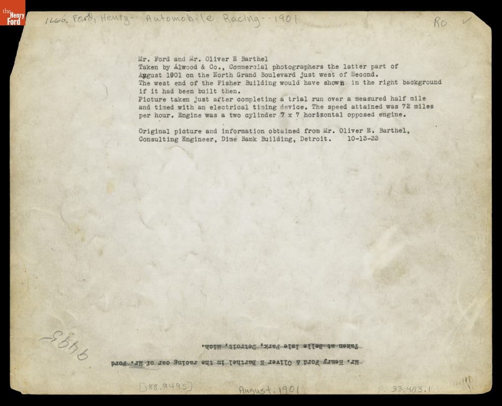 Mr. Ford and Mr. Oliver E Barthel Taken by Alwood [sic] & Co., Commercial photographers the latter part of August 1901 on the North Grand Boulevard just west of Second. The west end of the Fisher Building would have shown in the right background if it had been build then. Picture taken just after completing a trial run over a measured half mile and timed with an electrical timing device. The speed attained was 72 miles per hour. Engine was a two cyliner 7 x 7 horizontal opposed engine.e. Original picture and information obtained from Mr. Oliver E. Barthel, Consulting Engineer, Dime Bank Building, Detroit. 10-13-33