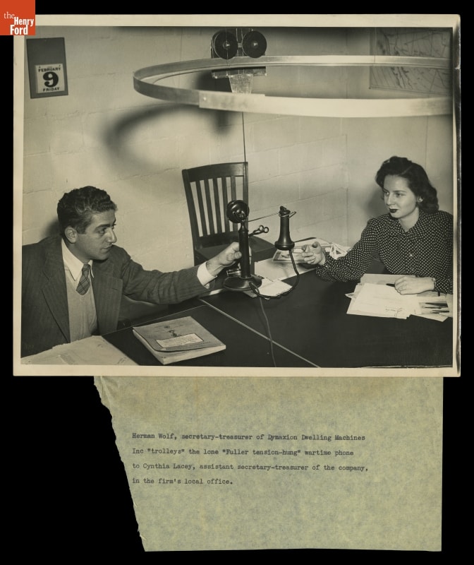 Herman Wolf, secretary-treasurer of the Dymaxion Dwelling Machines / Inc "trolleys" the lone "Fuller tension-hung" wartime phone / to Cynthia Lacey, assistant secretary-treasurer of the company, / in the firm's local office.