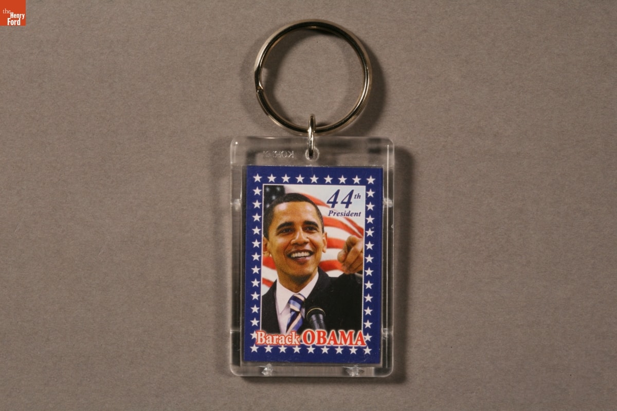 On January 20th, 2009, Barack Obama was sworn in as the 44th President of the United States. More than one million Americans came to Washington, D.C., to witness the inauguration of America's first African American president. Souvenirs, like this key fob, provided supporters with a tangible remembrance of this historic event.